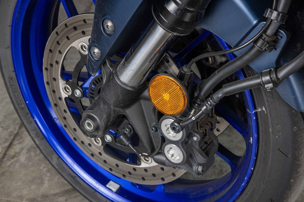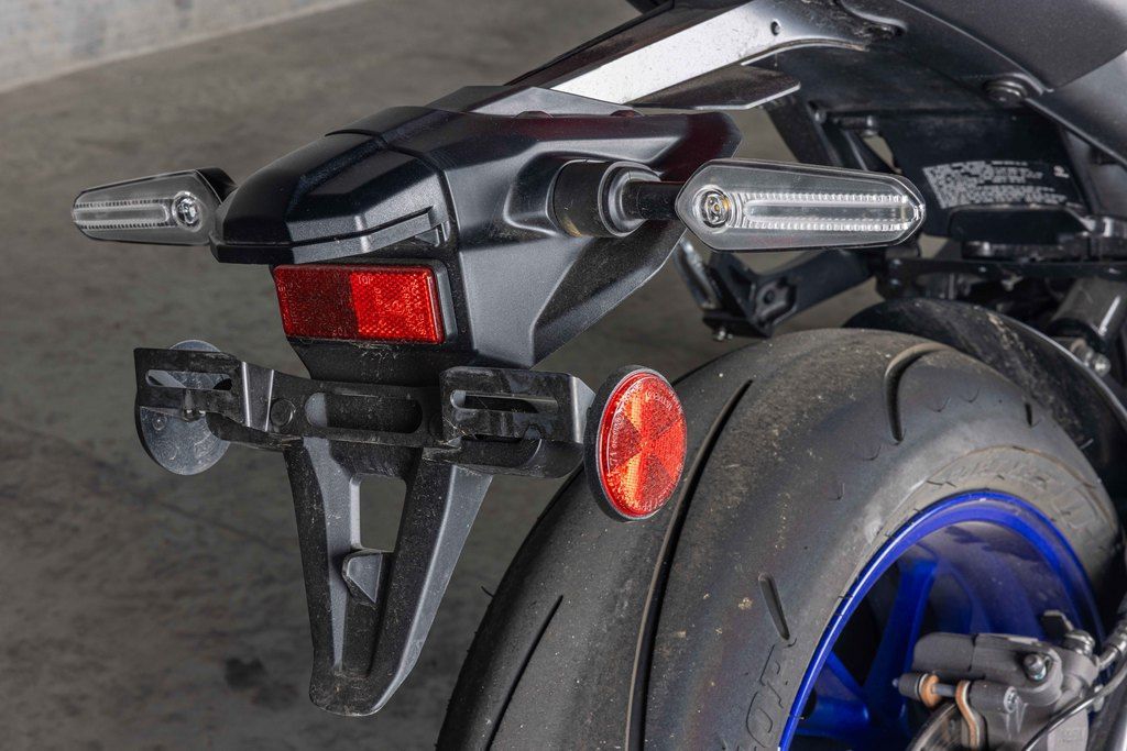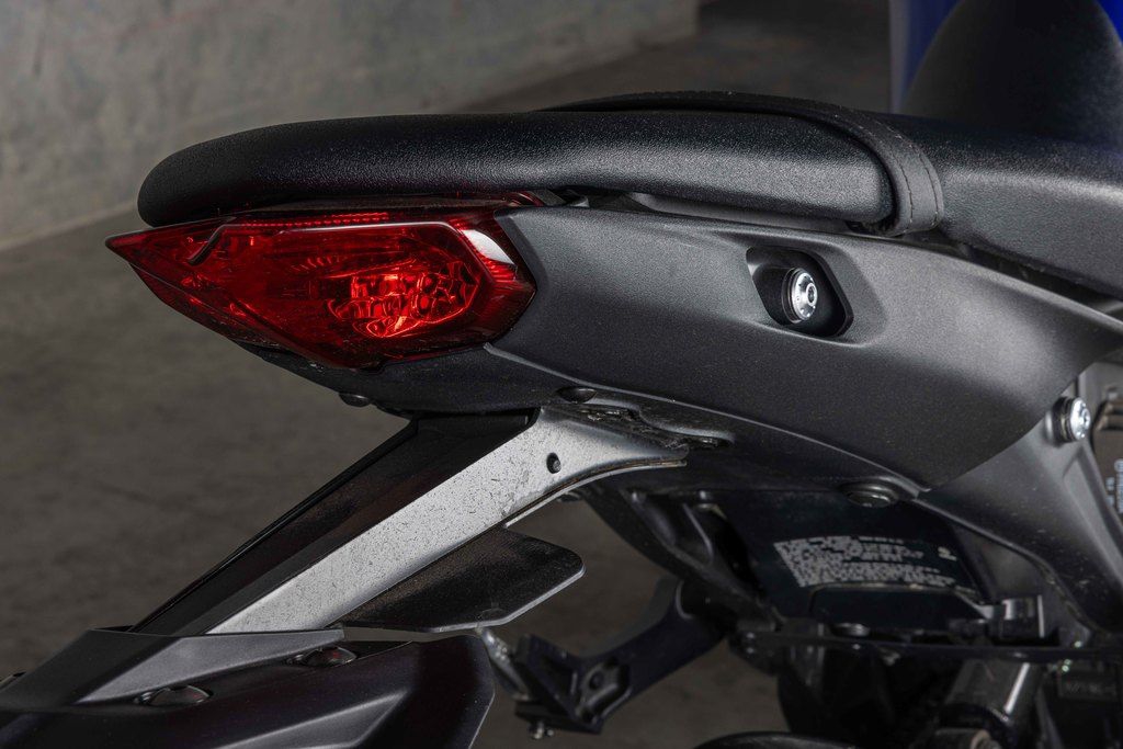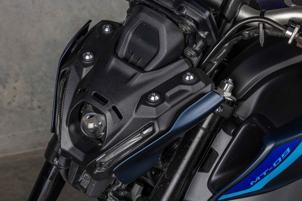 A compact bifunctional - low and high beam in one - LED headlight with excellent beam spread is featured on the MT-09. The edges of the beam have a softer contrast to be easy on the eyes while emitting a soft and even spread of illumination. Instead of the conventional “mono-focus” type headlight, this bike utilizes a projector design with a built-in internal lens in addition to the thick outer lens. Since the MT-09 uses not one but multiple LEDs to produce light, it can project a complex distribution of illumination across a broad field. The position lights use LEDs and light-guides to create an impressive, distinctive new front face design for the MT-09 while the turn signals and newly designed LED taillight are LED as well.