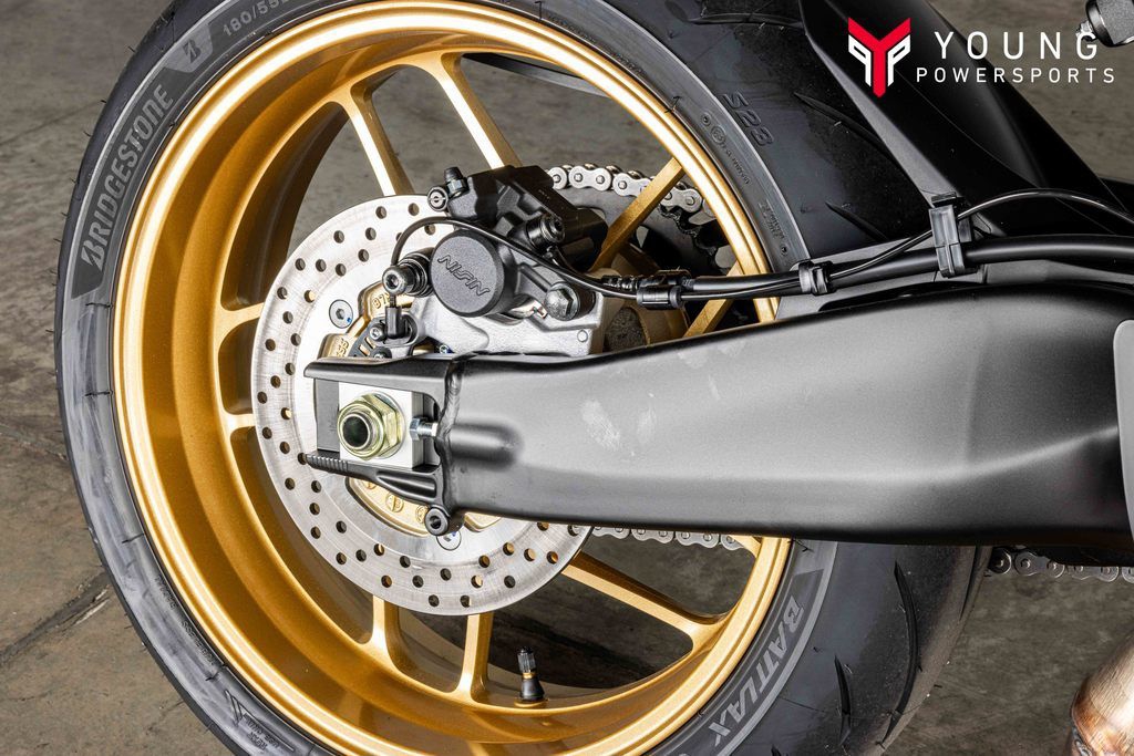 A box-section aluminum swingarm extends the wheelbase to augment straight-line stability.