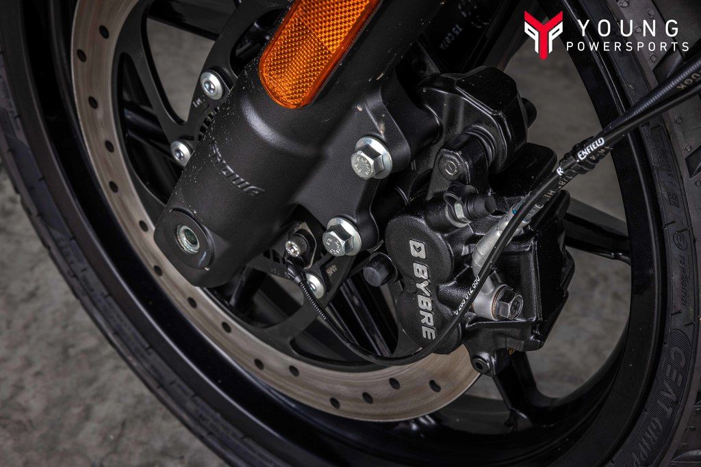 The Guerrilla 450’s 17” inch wheels, 120/70 front & 160/60 rear, wide-profile tubeless tyres with bespoke tread pattern keep you in control through all speeds and all situations.