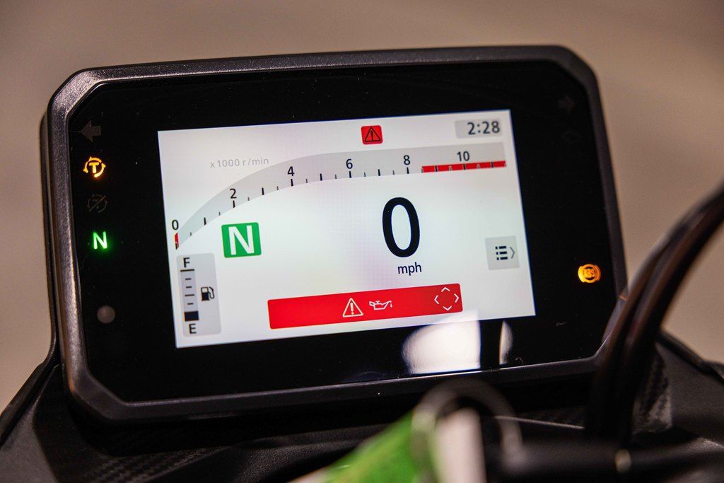 An easy-to-read digital LCD gauge cluster includes a speedometer, tachometer, odometer, multiple trip meters, and more.