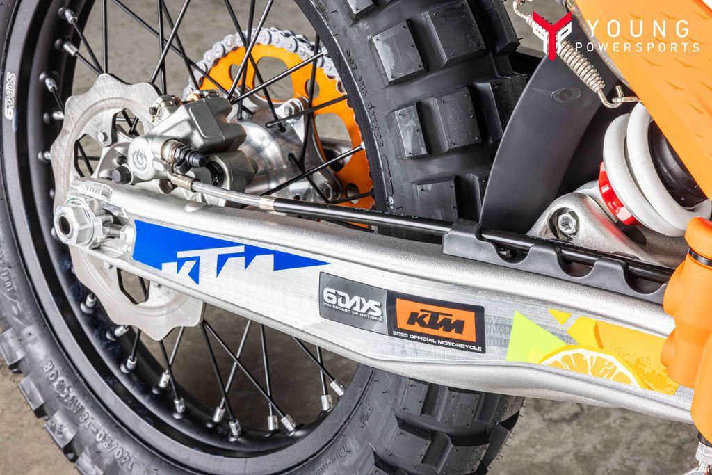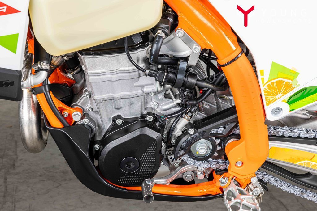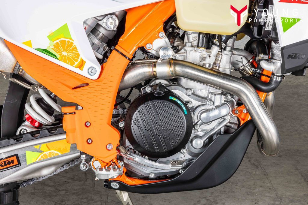 On the chargeSpecifically engineered for longitudinal rigidity, the KTM EXC-F range is engineered around a gloss-orange powder-coated frame providing exceptional rider feedback, energy absorption, and high-speed stability. This is achieved by repositioning the rotating masses in the frame along with a forged steering head connection. The footrest mounts also feature a slim design for less risk of hooking up. And when the ride comes to an end, a forged one-piece side stand ensures your enduro weapon stands proud.