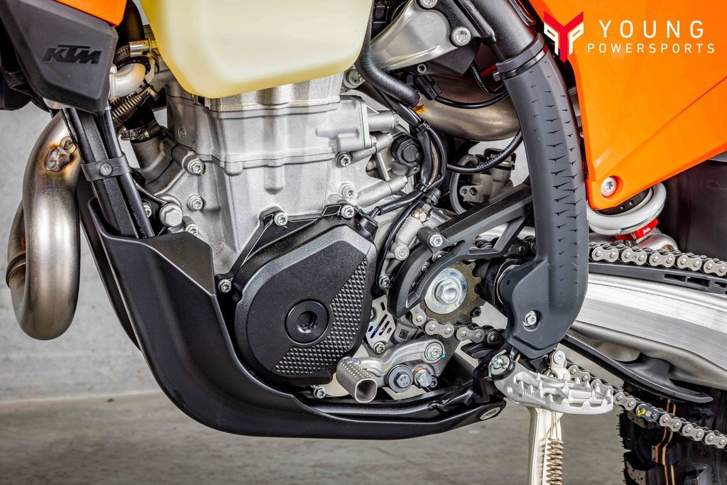 On the chargeSpecifically engineered for longitudinal rigidity, the KTM Enduro range is engineered around a black powder coated frame providing exceptional rider feedback, energy absorption, and high-speed stability. This is achieved by repositioning the rotating masses in the frame along with a forged steering head connection. The footrest mounts also feature a slim design for less risk of hooking up. And when the ride comes to an end, a forged one-piece side stand ensures your enduro weapon stands proud.
