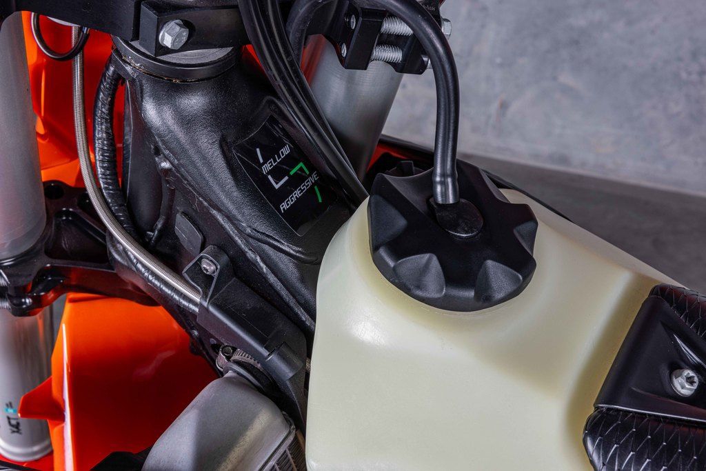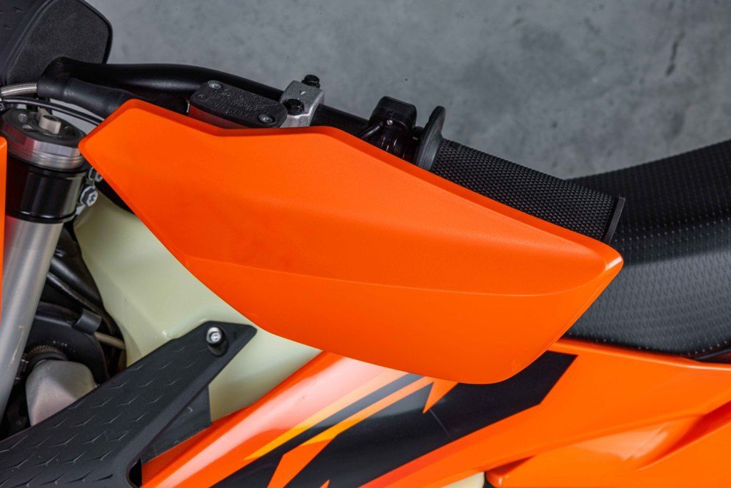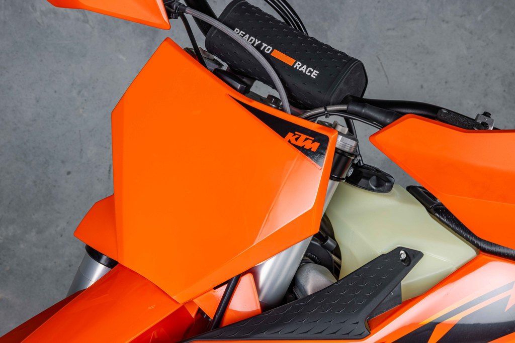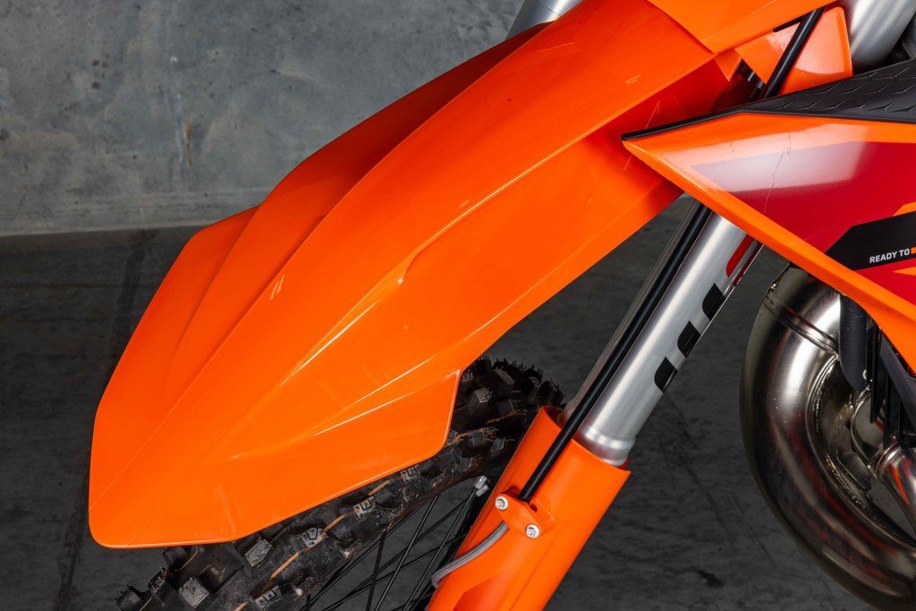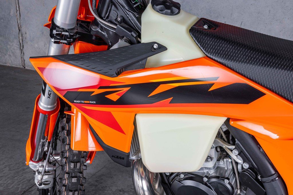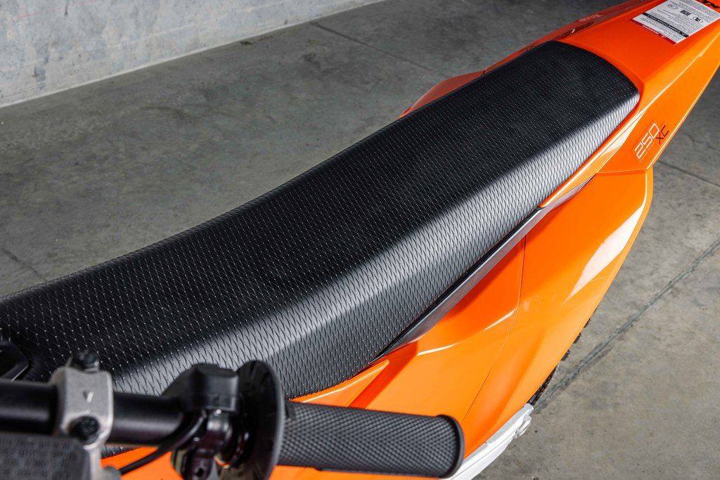 The 2025 KTM XC and XC-F range feature upgraded tank shrouds with bi-compound plastics, which work alongside the specially-developed rider triangle, to providing unmatched knee contact and gripping surfaces - especially when standing on the pegs. While the plastics work to expel mud buildup in wet, muddy conditions, the flat seat profile and high-grip orange seat cover providing exceptional rider movement and control.