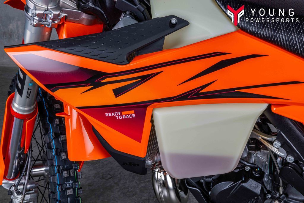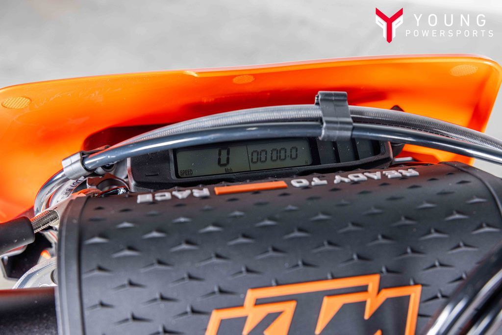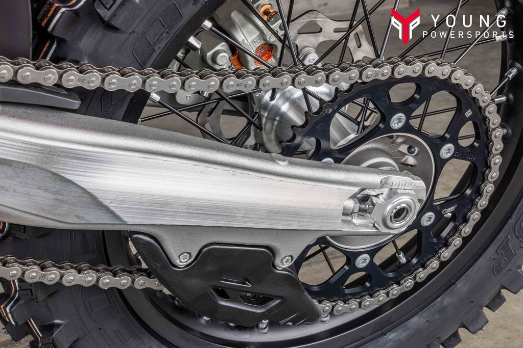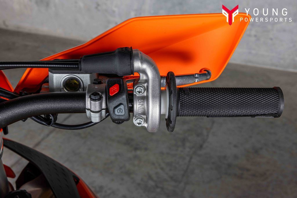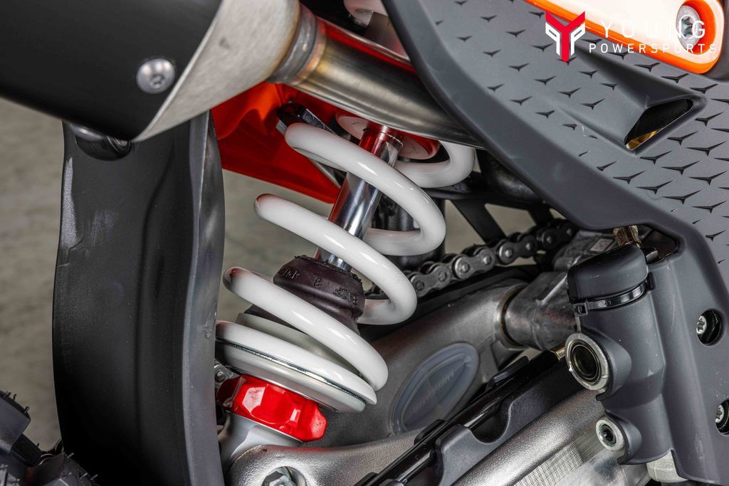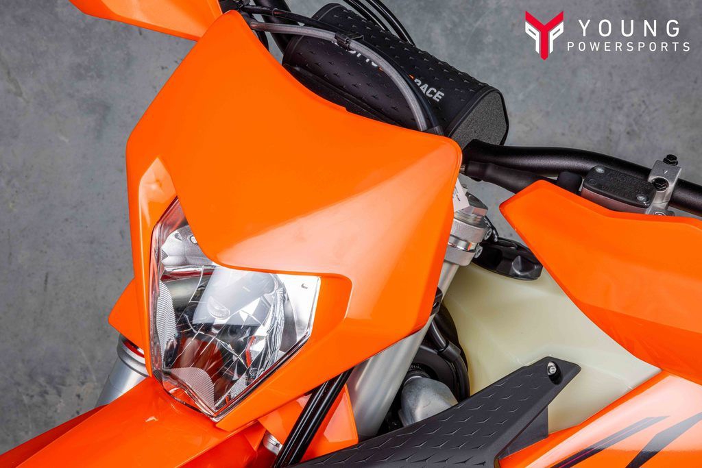On the chargeSpecifically engineered for longitudinal rigidity, the KTM Enduro range is engineered around a gloss-orange powder-coated frame providing exceptional rider feedback, energy absorption, and high-speed stability. This is achieved by repositioning the rotating masses in the frame along with a forged steering head connection. The footrest mounts also feature a slim design for less risk of hooking up. And when the ride comes to an end, a forged one-piece side stand ensures your enduro weapon stands proud.